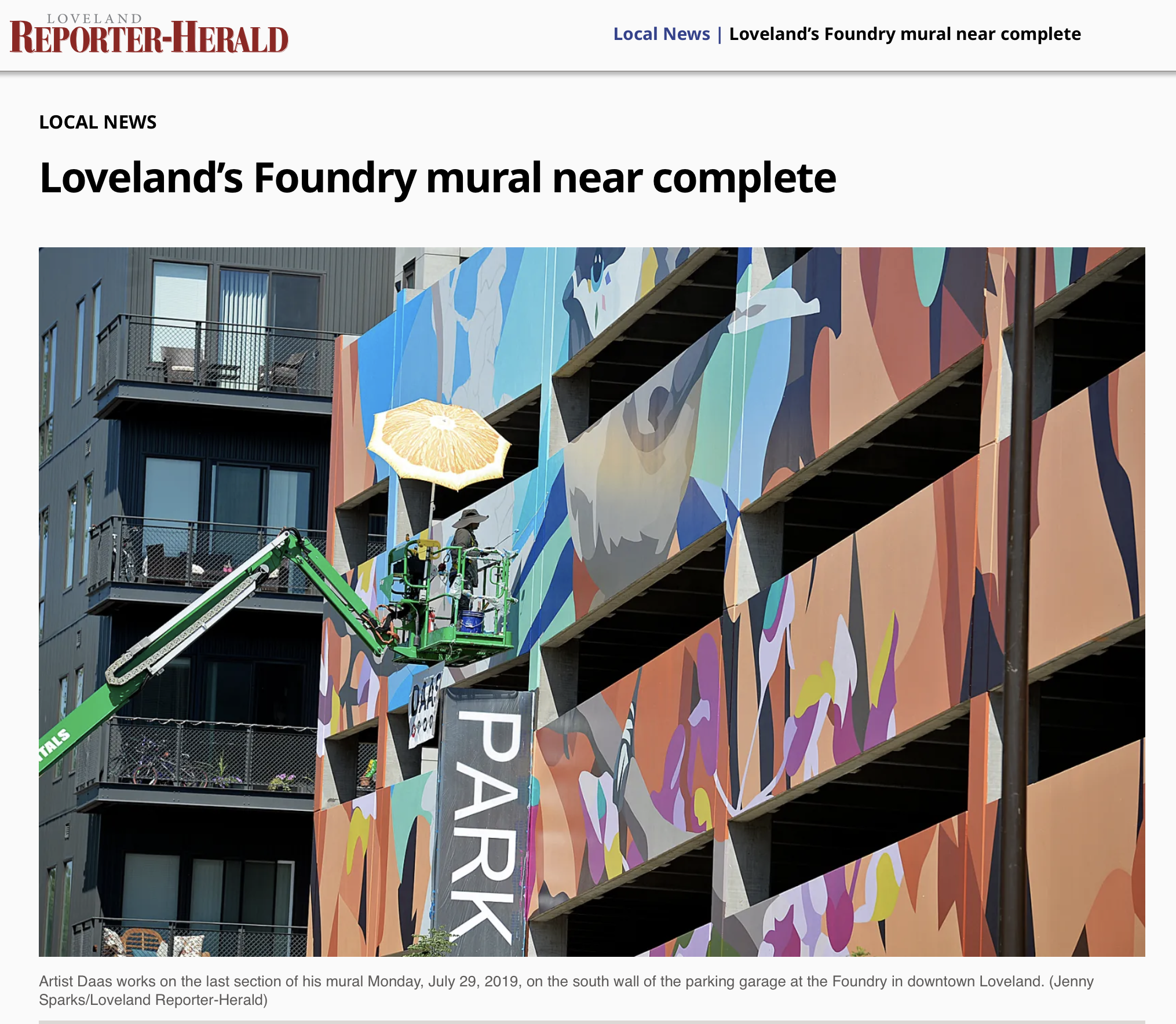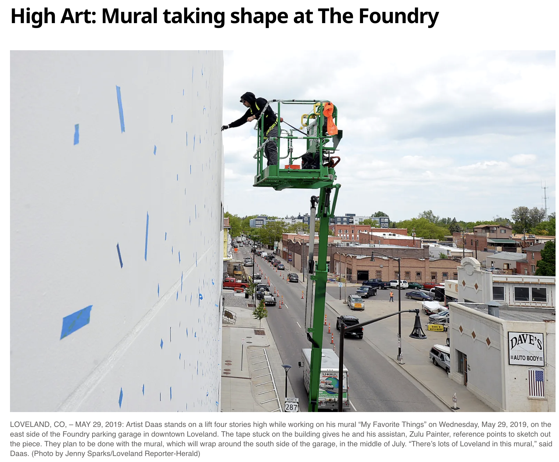 My Favorite Things shows a young girl from Loveland, Colorado, painting what she loves about her hometown on a HeARTs sculpture. She remembers birdwatching and hiking near the Devil’s Backbone. Inspired by Loveland’s nature and creativity, the mural uses bright colors and shapes to connect nature, culture, and community. Made for both walkers and drivers, the artwork has many details like wildflowers, mountains, and local symbols that celebrate Loveland’s spirit.